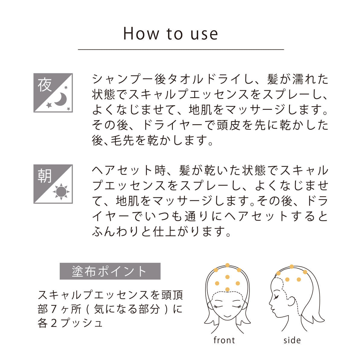 シャンプー後の清潔な状態でスキャルプエッセンスを頭頂部7か所を目安に、気になる部分に各2プッシュずつスプレーしながらよくなじませて、マッサージします。