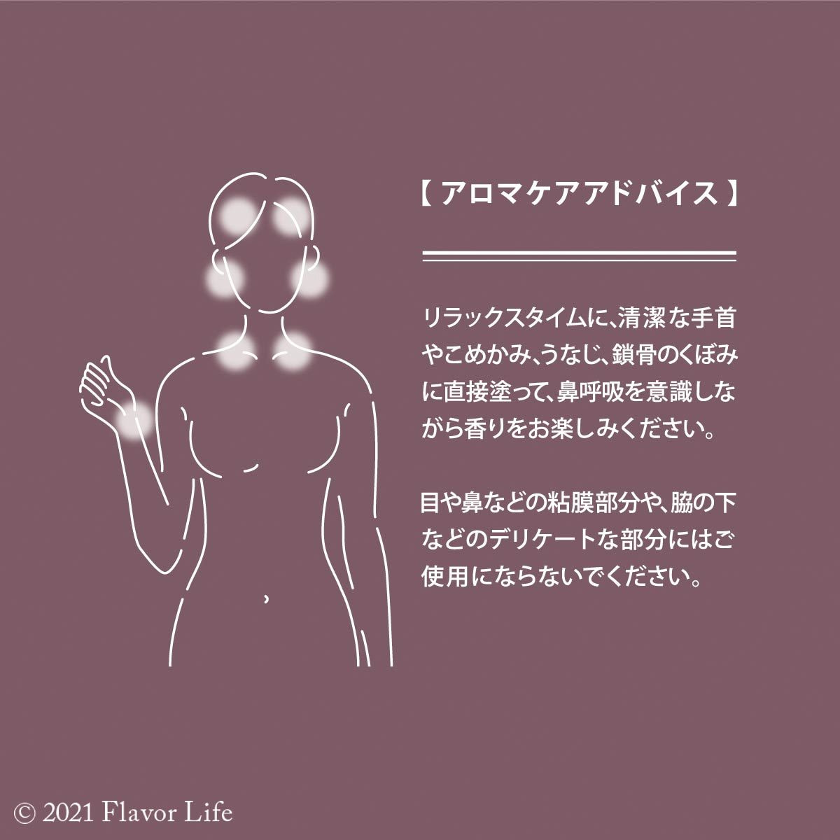 清潔な手首やこめかみ、うなじ、鎖骨のくぼみに直接塗って、鼻呼吸を意識しながら香りをお楽しみください。