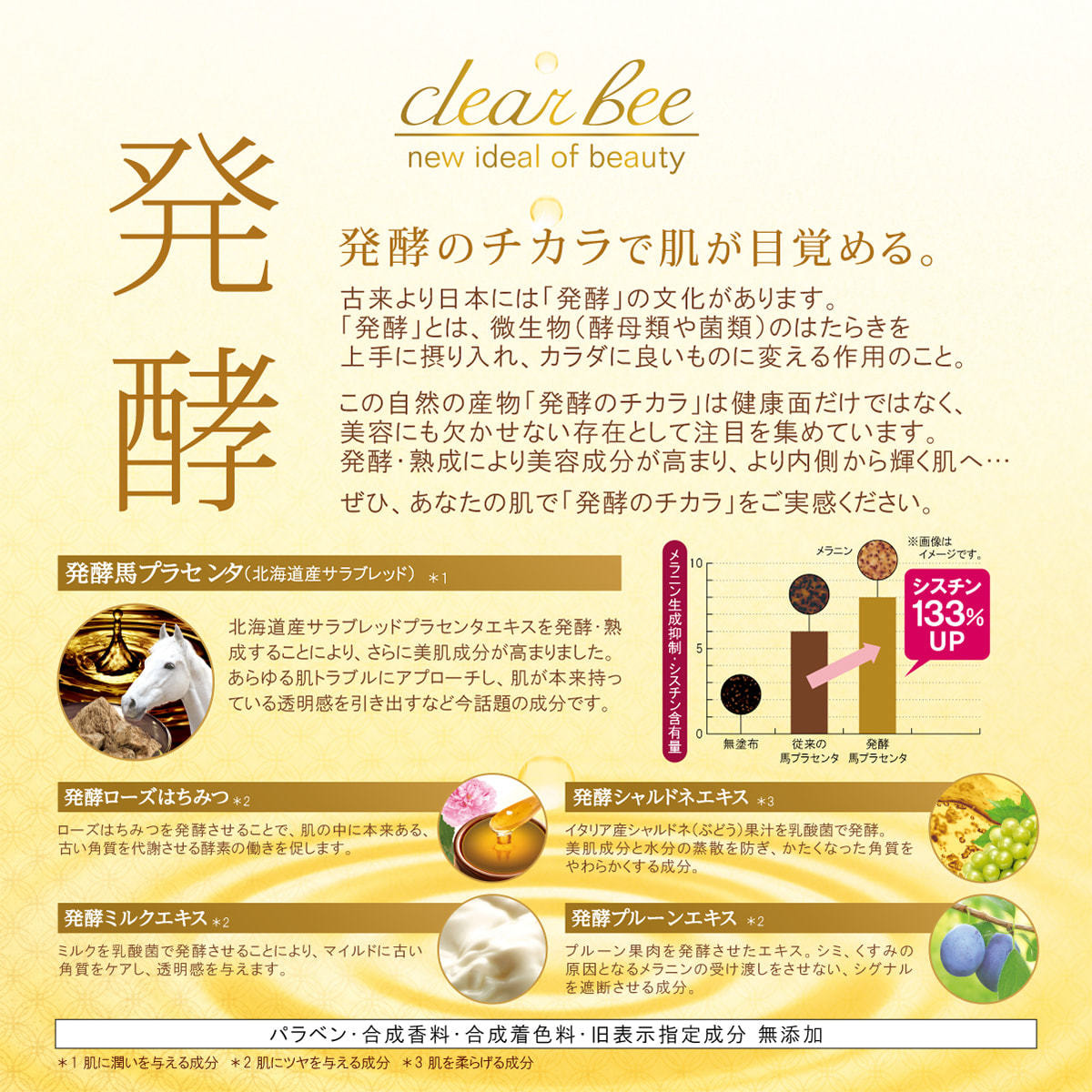 水、メトキシケイヒ酸エチルヘキシル、グリセリン、BG、エタノール、エチルヘキサン酸セチル、ジメチコン、レスベラトロール、サッカロミセス/(黒砂糖/プラセンタエキス)発酵液(ウマ)、グルコノバクター/ハチミツ発酵液、乳酸桿菌/ブドウ果汁発酵液、乳酸桿菌/乳発酵液、α-アルブチン、リン酸アスコルビルMg、トコフェロール、オレンジ果皮油、ラベンダー油、イランイラン花油、ビターオレンジ花油、ダイズ油、マイカ、酸化チタン、t-ブチルメトキシジベンゾイルメタン、ステアリン酸、ステアリン酸ソルビタン、ステアリン酸グリセリル(SE)、ポリソルベート60、PEG-60水添ヒマシ油、エチドロン酸、クエン酸Na、シクロペンタシロキサン、水添ポリイソブテン、ラウレス-7、キサンタンガム、ポリアクリルアミド、カプリリルグリコール