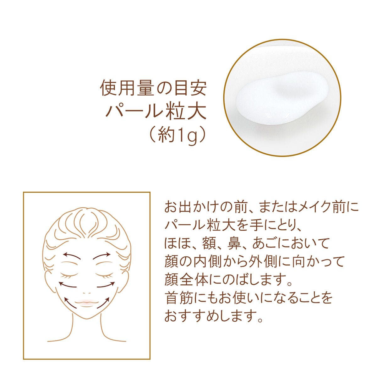 お出かけの前、またはメイク前にパール粒大を手にとり、ほほ、額、鼻、あごにおいて顔の内側から外側に向かって少しずつ顔全体にのばします。